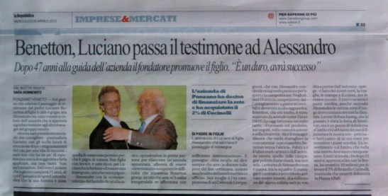Luciano Benetton sul Corriere di domenica 22 aprile 2012 parla in prima persona: a 47 anni dalla fondazione, passa la guida dell’azienda al figlio Alessandro per due anni vicepresidente. Gli argomenti che affronta il fondatore in uscita sono diversi. Parla brevemente di sé e dei fratelli, del suo percorso imprenditoriale, del figlio e delle caratteristiche degli imprenditori: