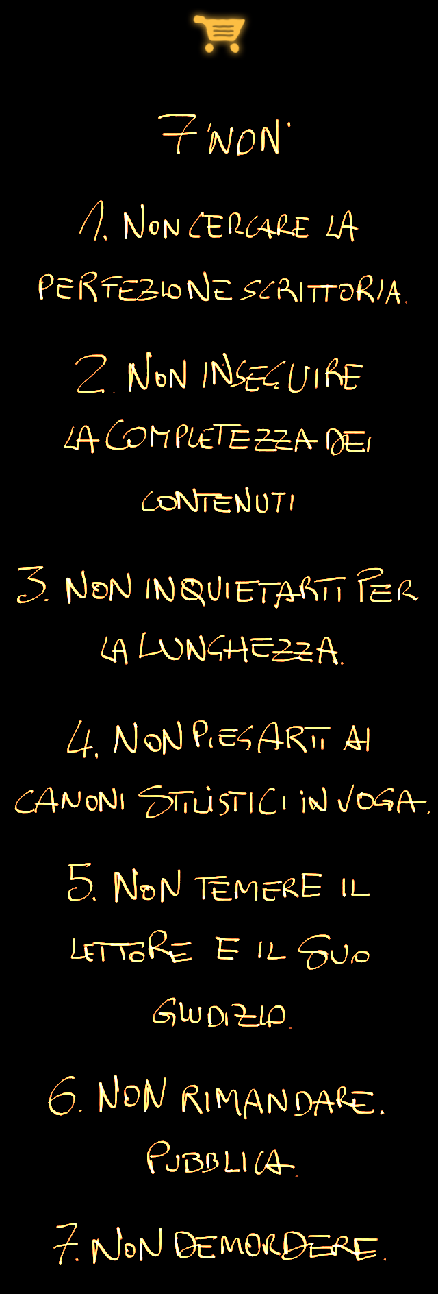 Eppure mi è sembrato che non rispondessero del tutto alle mie esigenze di indirizzo, né al mio bisogno di incoraggiamento pragmatico (la tecnicalità non è tutto). Così mi sono detto che potevo scrivermi da me il mio codice di condotta personale, e metterlo a disposizione per ulteriori insoddisfatte aspettative, generatrici di creatività.