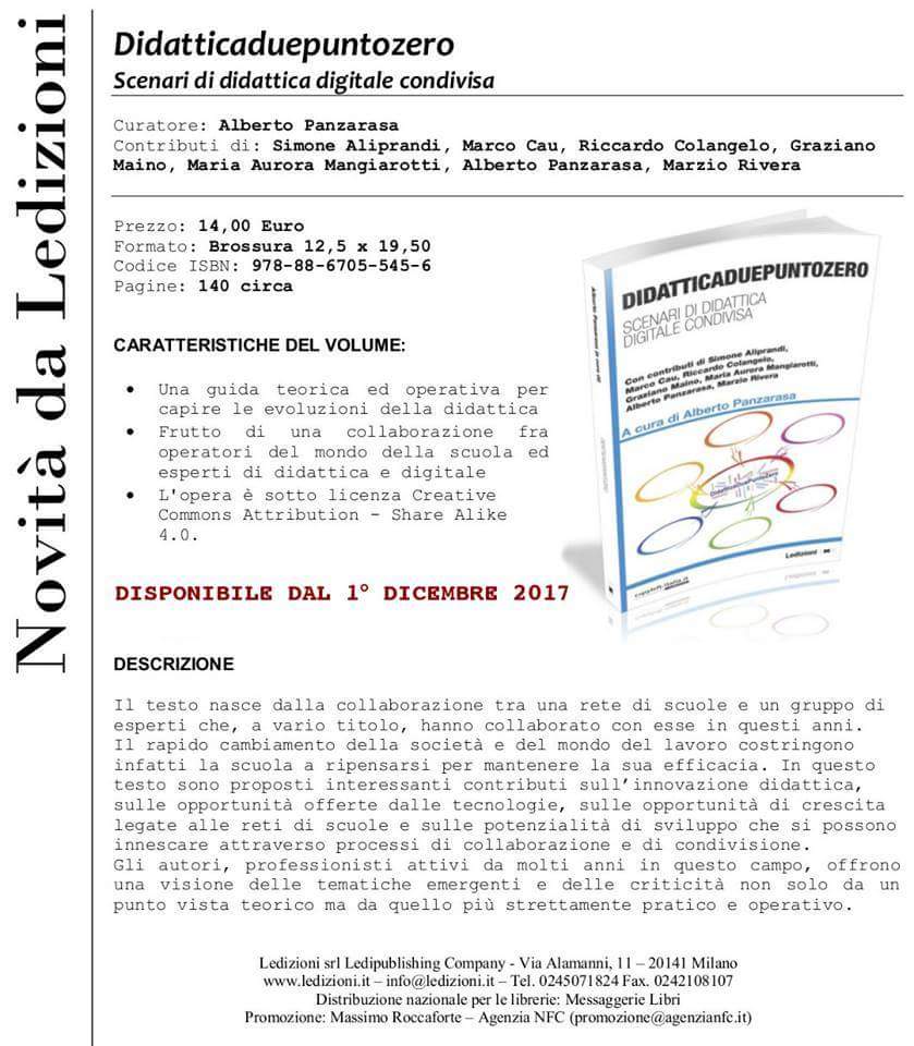 Nel libro “Didatticaduepuntozero” vengono presentati contributi su innovazione didattiche offerte dalle tecnologie, opportunità di crescita legate alle reti di scuole, potenzialità di sviluppo che si possono costruire attraverso processi di condivisione.