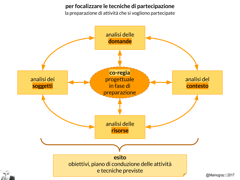Le tecniche aiutano a promuovere partecipazione, ma la partecipazione non è solo tecniche di facilitazione (benché a volte queste occupino la scena). La partecipazione – anche nei microprocessi – richiede un lavoro di regia più articolato (prima, durante, dopo).