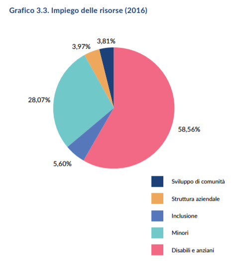 La percentuale 58,56% indica le risorse utilizzate da Sercop per servizi rivolti a persone anziane e persone con disabilità. La struttura aziendale per i costi di funzionamento utilizza quasi il 4% delle risorse complessive, e altrettante risorse sono destinate allo sviluppo di comunità (3,81%), mentre per l’inclusione la percentuale di risorse supera il 5% e per i minori il 28%. I valori assoluti e le attività sono poi oggetto di approfondimenti nei diversi capitoli del bilancio sociale.