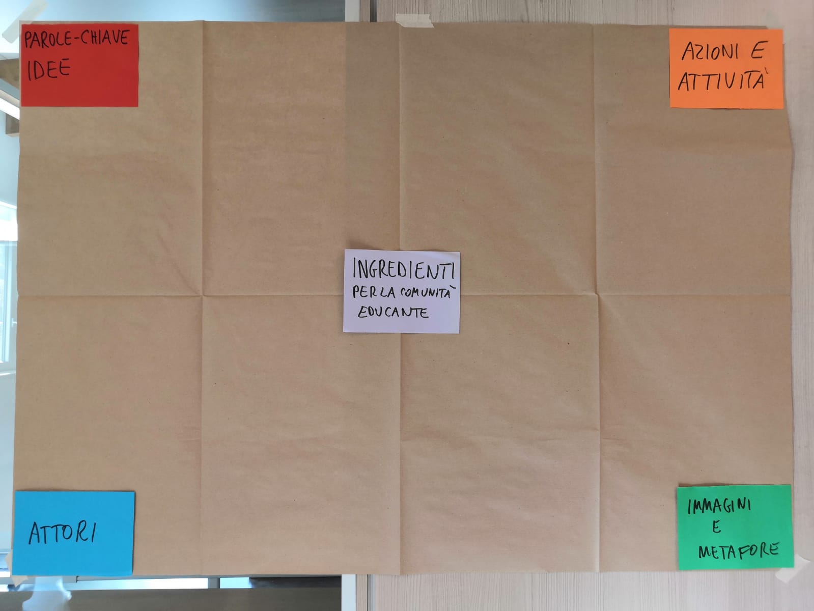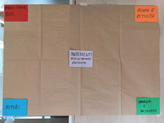 | L’eventuale costruzione di un quadro di insieme | A volta, se il tempo e lo spazio lo consentono, è utile spostare i fogli da un cartellone all’altro e creare un unico prodotto visuale, che scaturisce dalla fusione dei lavori prodotti dai due (o più gruppi). L’effetto è quello di aggregare le idee e produrre un unico quadro colorato (anche usando direttamente la parete come supporto per riprodurre al centro la domanda-guida e creare i quattro quadranti di sviluppo e approfondimento). |