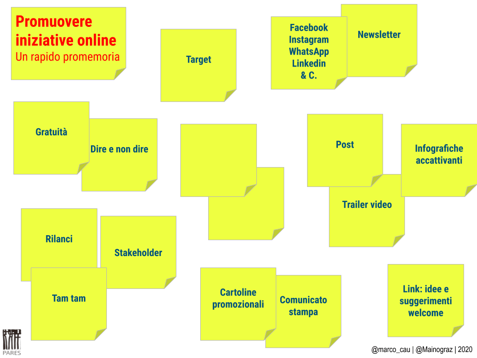 In questi giorni si moltiplicano le iniziative online. Anche queste vanno promosse e pubblicizzate, tenendo conto delle competenze e delle energie di cui si dispone o che si possono mettere in movimento. Si tratta di scegliere di volta in volta attività e modalità che siano sostenibili e che appaiano più efficaci, anche considerando le specificità dell’iniziativa che si propone (web-evento, webinar, weblab, gruppo di lettura, di studio, di riflessione).